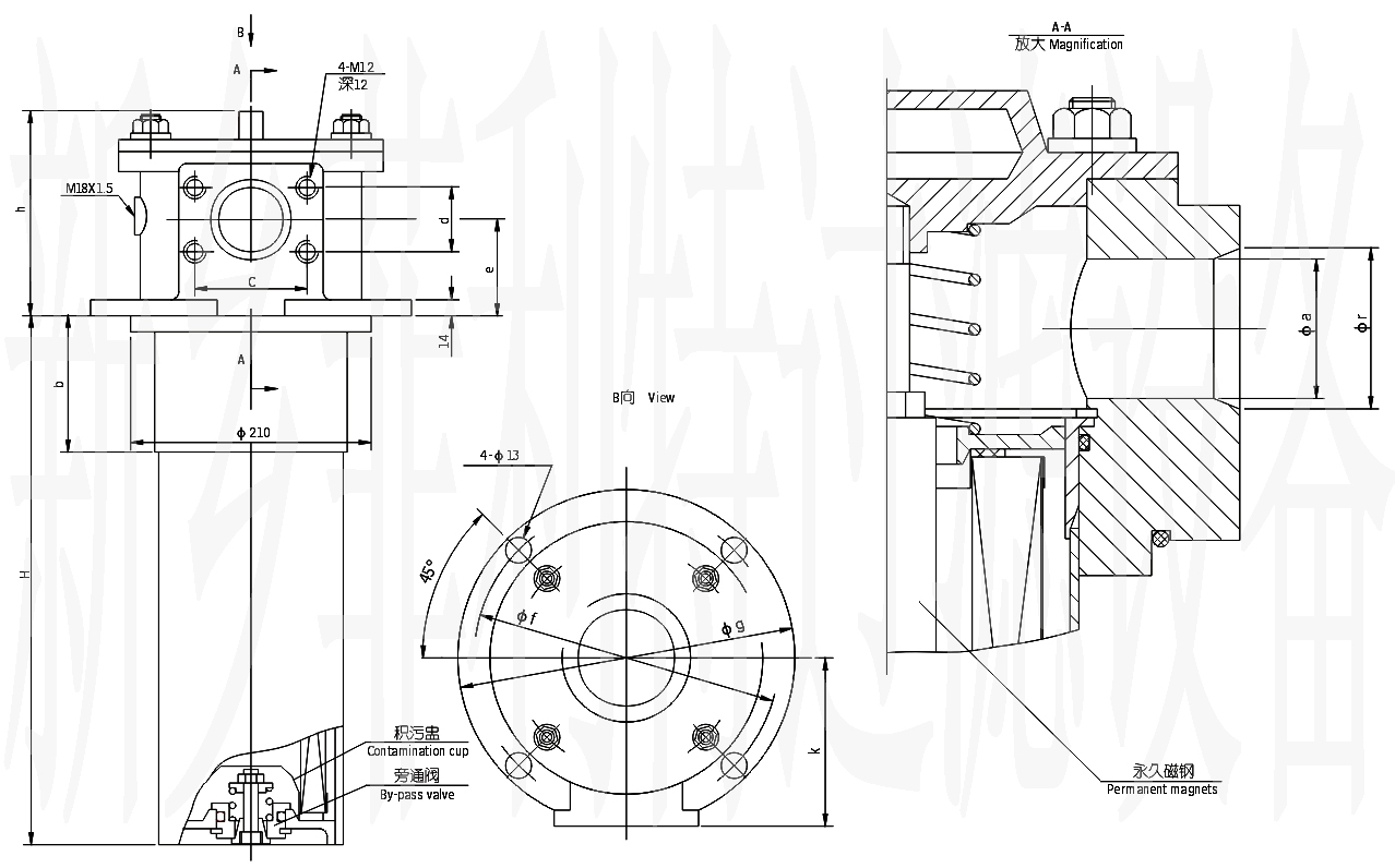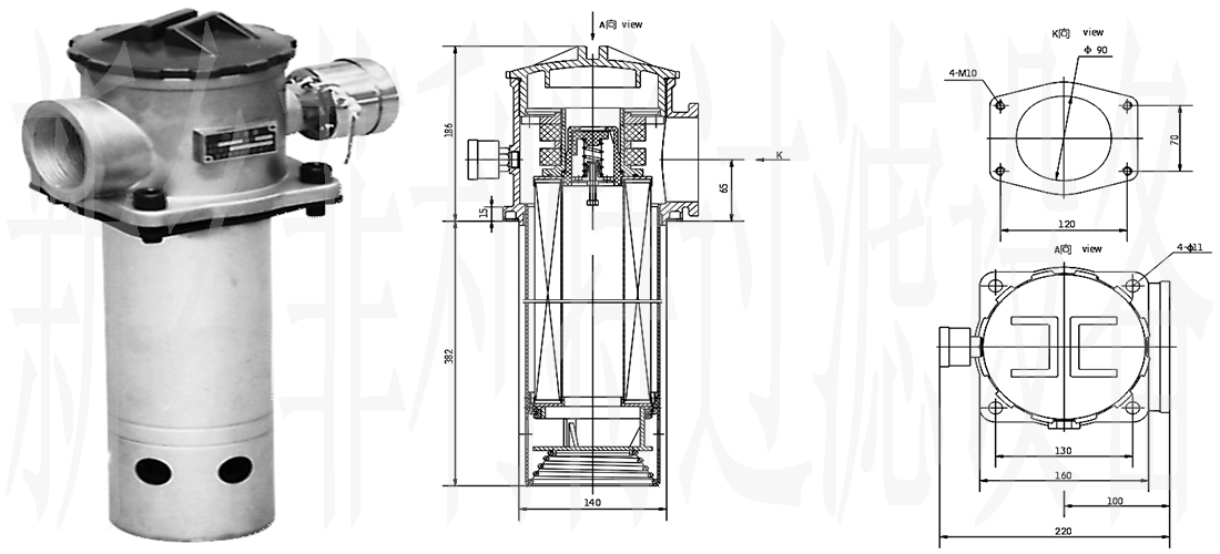 這種過濾器設有濾芯污染堵塞發訊器和油路旁通閥,當回油壓力達到0.35MPa時,發訊器發出開關信號或報警,還可直接從發訊器的表盤上讀出回油壓力值,以提示操作人員及時更換濾芯,系統油液的清潔度。更換濾芯只需旋開過濾器端蓋即可。當回油壓力上升至0.4MPa時,過濾器內的旁通閥便自動卸荷,以避免回油壓力上升至0.4MPa時,過濾器內的旁通閥便自動卸荷,以避免回油壓力過高造成整個系統工作性能不良。