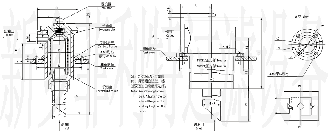 3、具有旁通閥:當濾芯被污染物堵塞到出油口真空度為0.018MPa時,發(fā)訊器便發(fā)出信號,應及時更換 或清洗濾芯。若此時不能馬上停機或無人來更換濾芯,設在濾芯上部的油路旁通閥會自動開啟(開啟壓力:真空0.02MPa),以避免油泵出現(xiàn)吸空等故障。