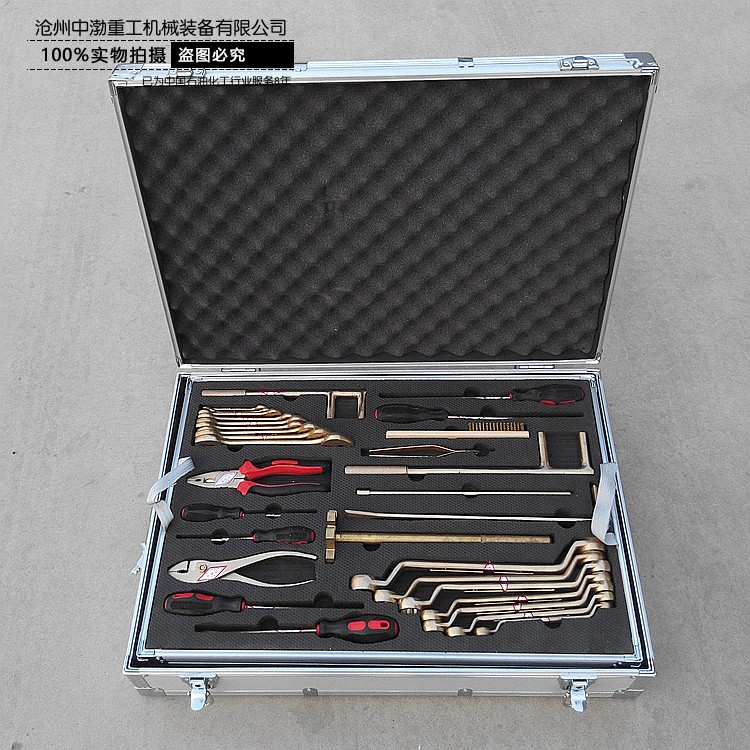 公司生產(chǎn)的防爆工具箱種類齊全,包括:加油站用組合工具箱、油庫用組合工具箱、天然氣用組合工具箱、礦山搶險(xiǎn)用組合工具箱、檢維修用組合工具箱、成品油計(jì)量工具箱等。  工具箱規(guī)格:7件套、10件套、12件套、16件套、24件套、30件套、32件套、36件套、42件套、50件套、56件套、100件套等。公司還可以根據(jù)客戶的實(shí)際工作需要組合常用的防爆工具套裝。   公司生產(chǎn)的防爆工具有400余個(gè)系列近萬種規(guī)格。該產(chǎn)品能有效的防止工具與工作物相互摩擦、撞擊時(shí)產(chǎn)生的可燃性爆炸,確保財(cái)產(chǎn)和人身安全。廣泛用于石油、化工、礦山、防恐怖、防磁場、煤礦、采氣、油氣管道、發(fā)電、冶金、航空、儲(chǔ)運(yùn)、制藥、制氣、塑料、化纖、皮革、煙火、爆竹等行業(yè)。